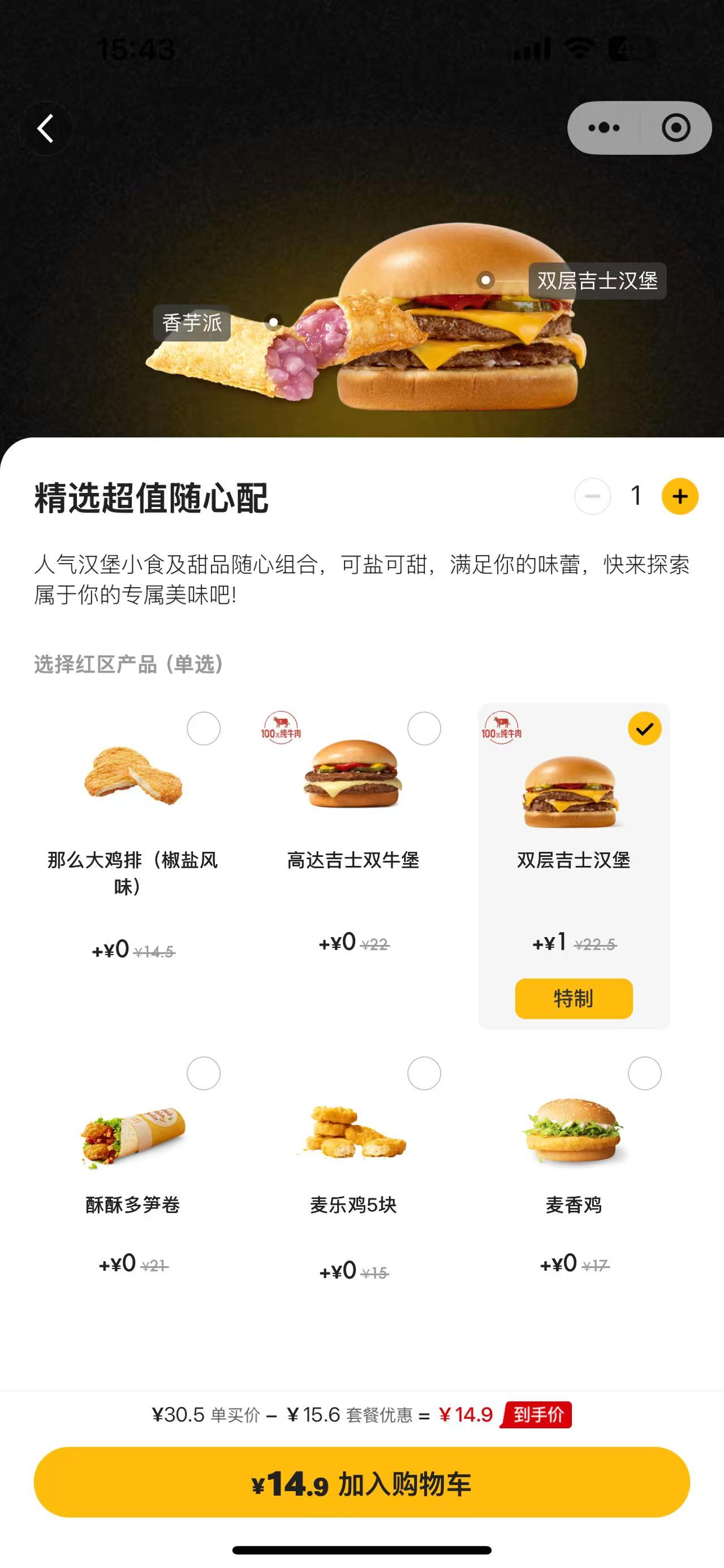 今日有网友发觉,少许麦当劳餐品的价钱有所上调。个中,麦当劳1+1随心配白区中的单层善人汉堡加价1元。 当日,麦当劳中原圆里背记者吐露,12月15日起,个人餐品的价钱扩充0.5到1元。